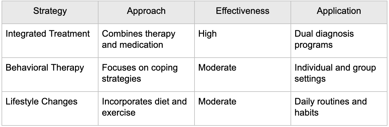 Management strategies for ADHD and substance misuse can be compared by effectiveness and clinical application in the table below.