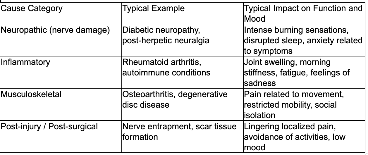 Different physical causes present with distinct clinical patterns. The table below compares major cause types, examples, and their impact on your function and mood.