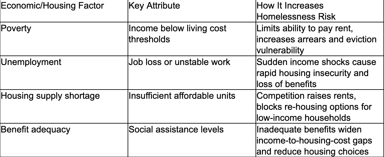 The table below compares economic and housing factors, their core attributes, and their influence on homelessness risk: