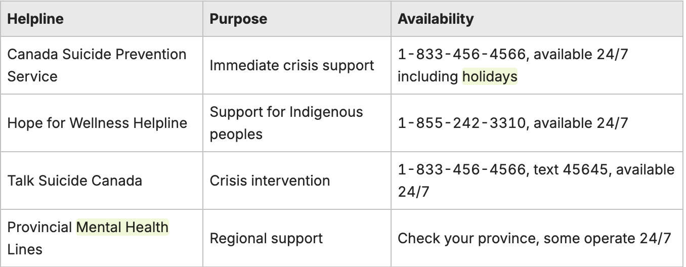 Identifying contacts who will be available during the October long weekend is essential, as some services may have reduced hours. Your support network should include people accessible throughout Saturday, Sunday, Monday, and the transition back to work on Tuesday.
